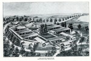 Doctors Charles Elmer Sawyer and his son, Carl Walker Sawyer, opened Sawyer Sanatorium on White Oaks Farm in 1911. Built to provide physical and emotional healing in a unique environment, the complex incorporated six patient bungalows, houses for the two doctors, offices, a large dining and social hall, and treatment buildings. An enclosed quarter-mile-long cloister connected these buildings around a large courtyard. Each bungalow, given botanical names such as “Ivy” and “Rose,” contained individual patient rooms, a communal living room, and bathing facilities. Hydropathic and electropathic treatments buildings were added later. A shady ten-acre knoll on the farm featured a grove of white oak trees that served as a picnic area for patients. Over the years, the facility also hosted local and national social and political events. (Continued on other side)