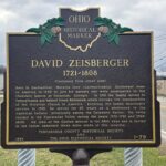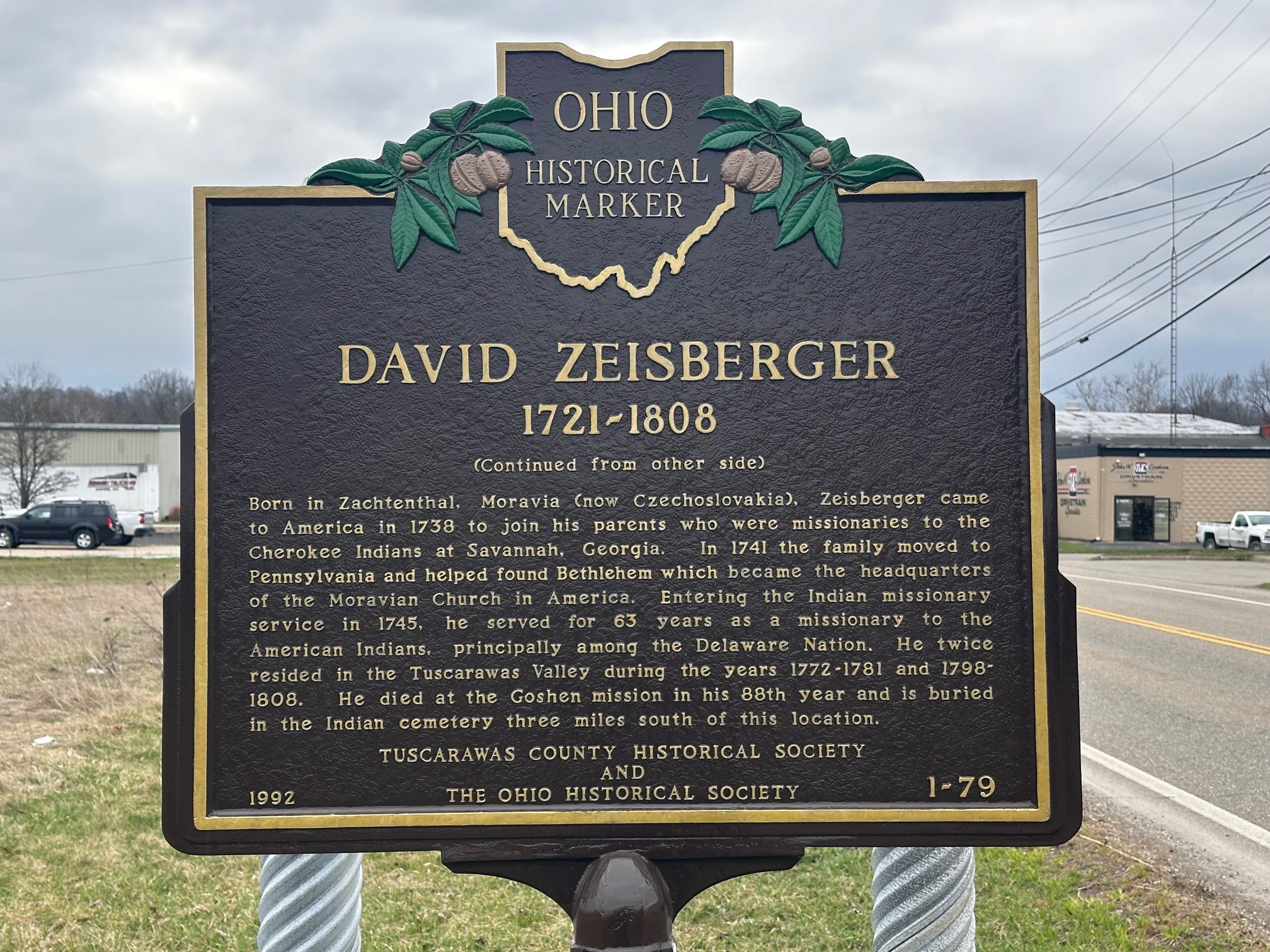 Side B: Born in Zachtenthal, Moravia (now Czechoslovakia), Zeisberger came to America in 1738 to join his parents who were missionaries to the Cherokee Indians at Savannah, Georgia. In 1741 the family moved to Pennsylvania and helped found Bethlehem which became the headquarters of the Moravian Church in America. Entering the Indian missionary service in 1745, he served for 63 years as a missionary to the American Indians, principally among the Delaware Nation. He twice resided in the Tuscarawas Valley during the years 1772-1781 and 1798-1808. He died at the Goshen mission in his 88th year and is buried in the Indian cemetery three miles south of this location.