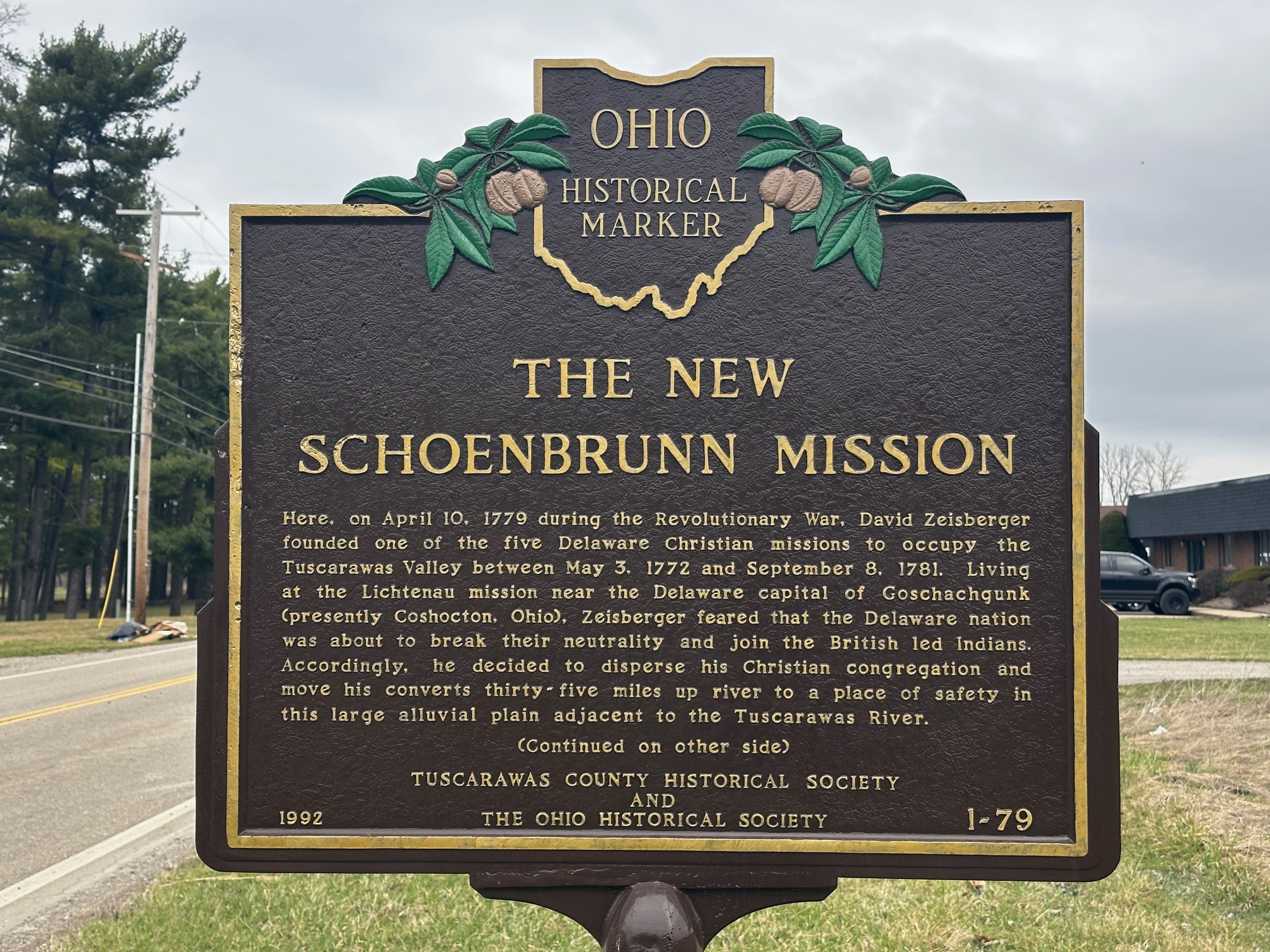 Side A: Here, on April 10, 1779 during the Revolutionary War, David Zeisberger founded one of the five Delaware Christian missions to occupy the Tuscarawas Valley between May 3, 1772 and September 8, 1781. Living at the Lichtenau mission near the Delaware capital of Goschachgunk (presently Coshocton, Ohio), Zeisberger feared that the Delaware nation was about to break their neutrality and join the British led Indians. Accordingly, he decided to disperse his Christian congregation and move his converts thirty-five miles up river to a place of safety in this large alluvial plain adjacent to the Tuscarawas River.