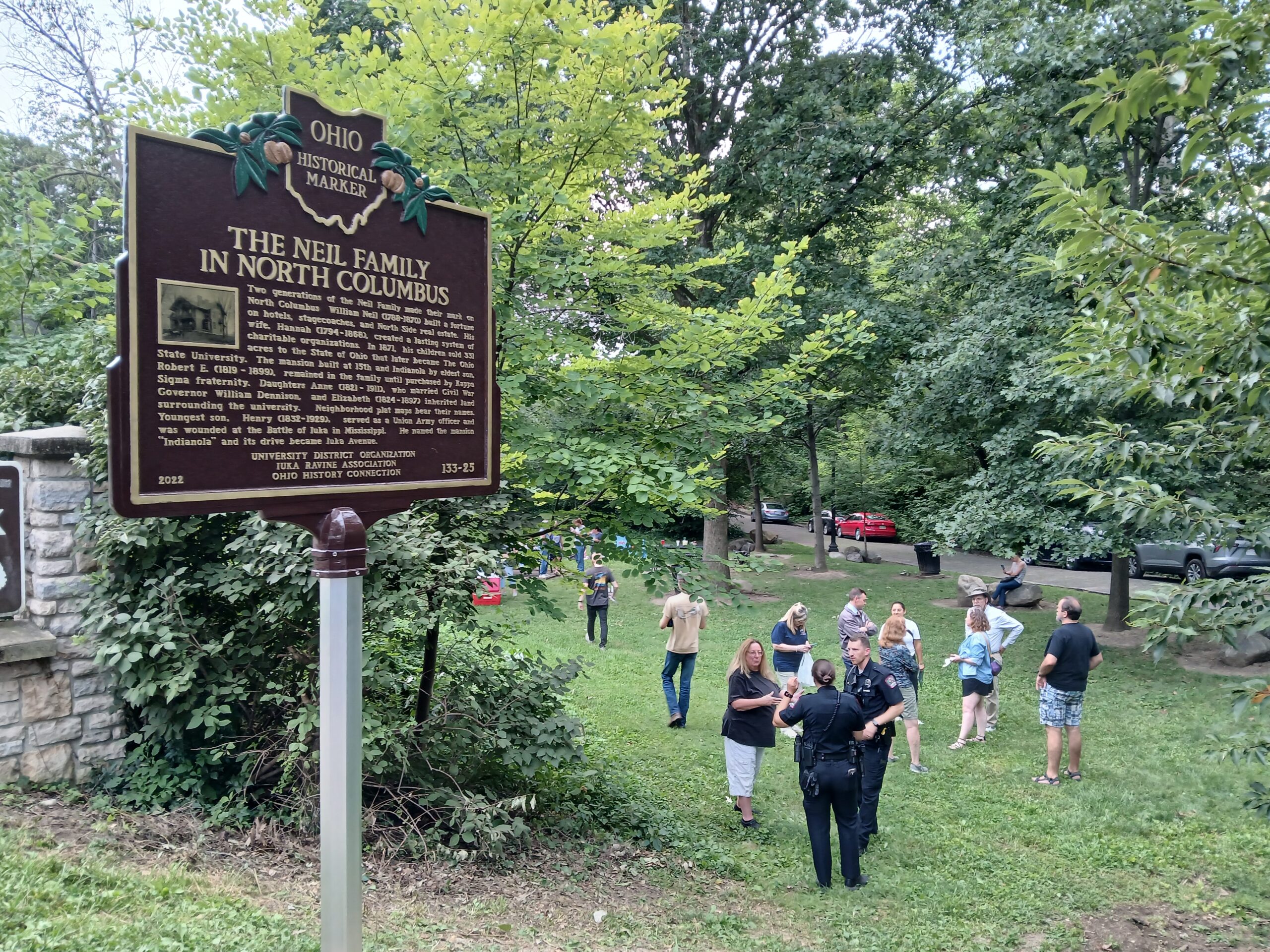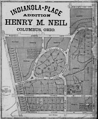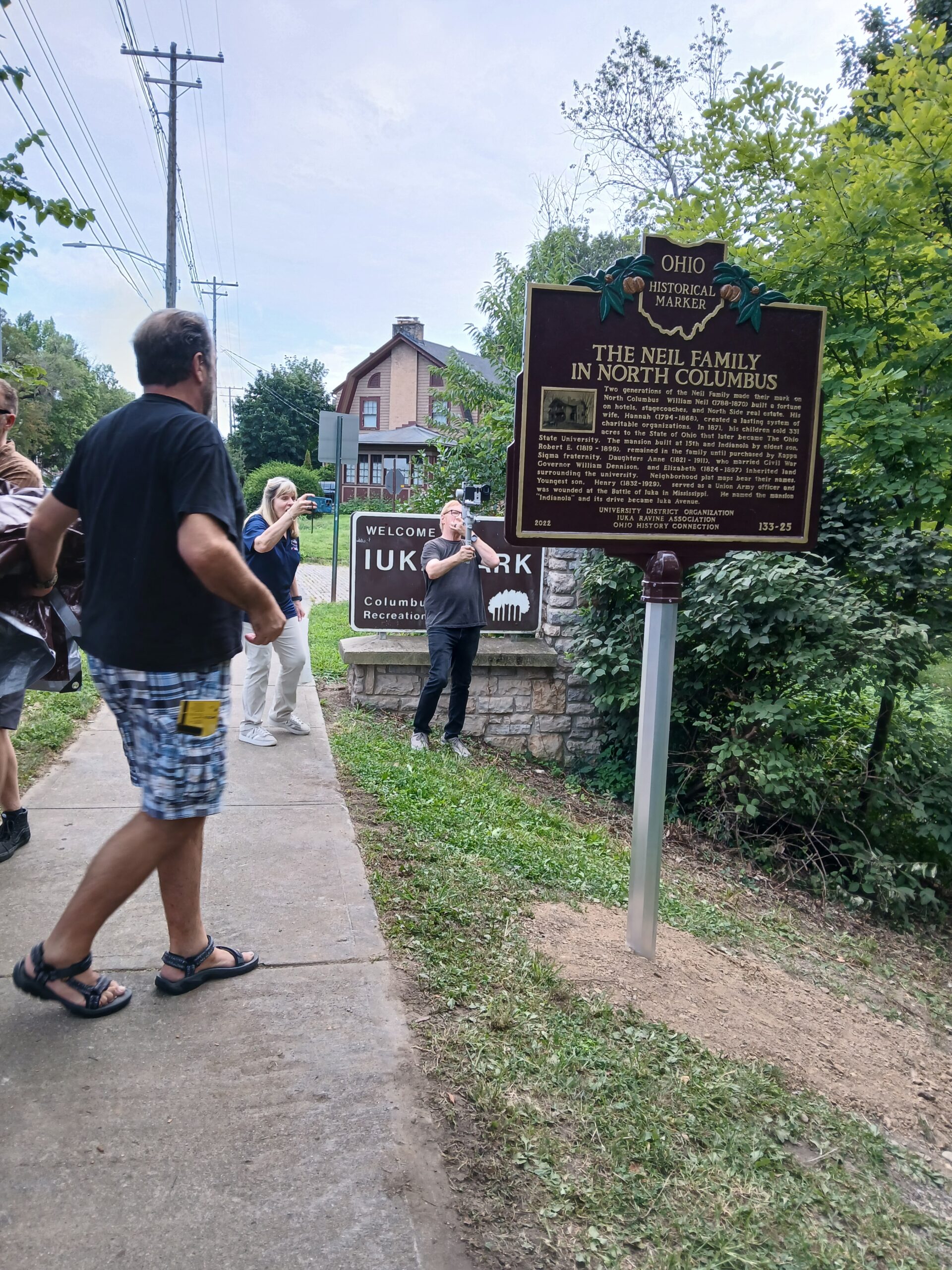 Side B: Two generations of the Neil family made their mark on North Columbus. William Neil (1788-1870) built a fortune on hotels, stagecoaches, and North Side real estate. His wife, Hannah (1794-1868), created a lasting system of charitable organizations. In 1871, his children sold 331 acres to the State of Ohio that later became The Ohio State University. The mansion built at 15th and Indianola by eldest son, Robert E. (1819-1899), remained in the family until purchased by Kappa Sigma fraternity. Daughters Anne (1821-1911), who married Civil War Governor William Dennison, and Elizabeth (1824-1897) inherited land surrounding the university. Neighborhood plat maps bear their names. Youngest son, Henry (1832-1929), served as a Union Army officer and was wounded at the Battle of Iuka in Mississippi. He named the mansion “Indianola” and its drive became Iuka Avenue.