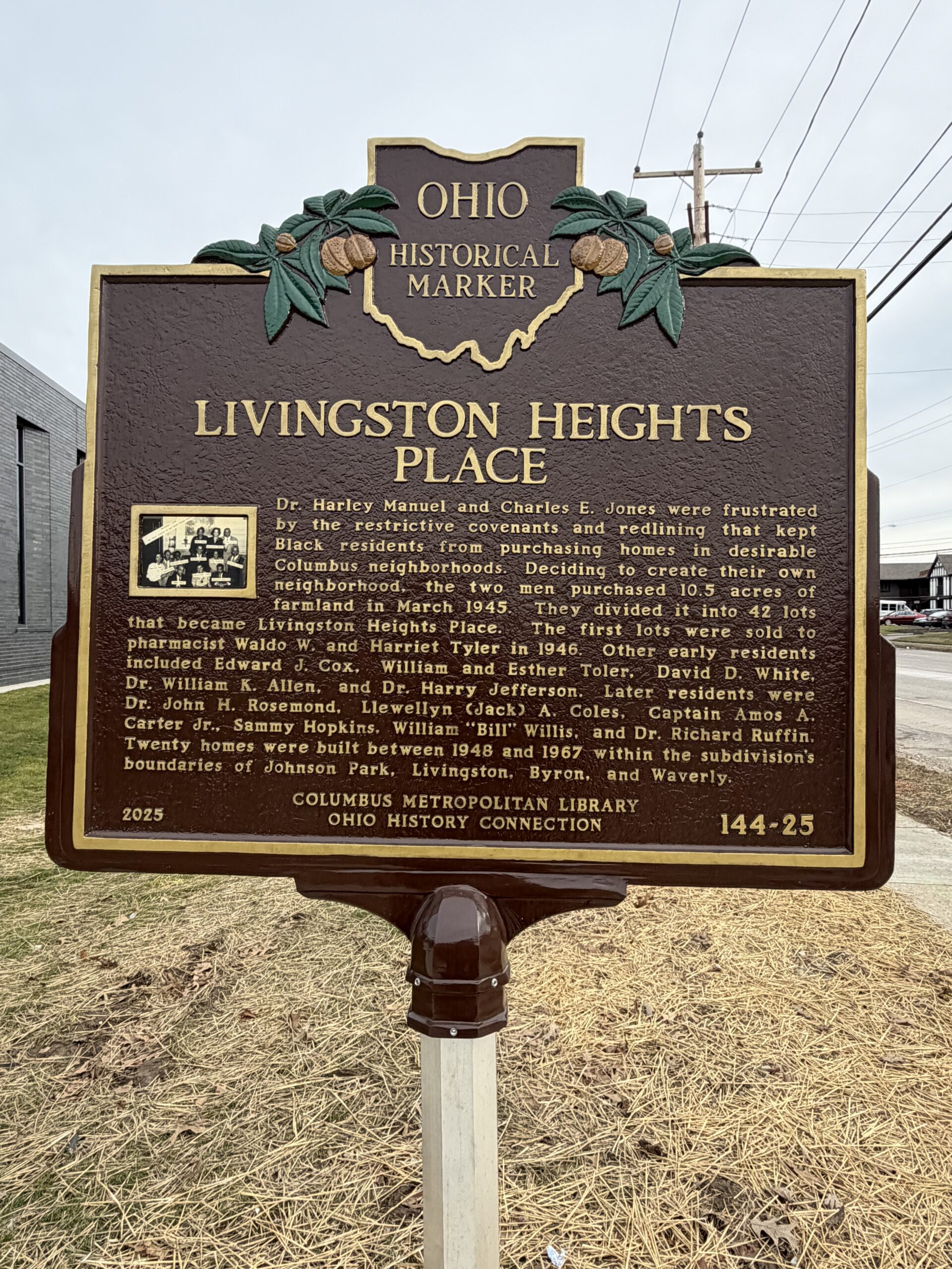 Side A: Dr. Harley Manuel and Charles E. Jones were frustrated by the restrictive covenants and redlining that kept Black residents from purchasing homes in desirable Columbus neighborhoods. Deciding to create their own neighborhood, the two men purchased 10.5 acres of farmland in March 1945. They divided it into 42 lots that became Livingston Heights Place. The first lots were sold to pharmacist Waldo W. and Harriet Tyler in 1946. Other early residents included Edward J. Cox, William and Esther Toler, David D. White, Dr. William K. Allen, and Dr. Harry Jefferson. Later residents were Dr. John H. Rosemond, Llewellyn (Jack) A. Coles, Captain Amos A. Carter Jr., Sammy Hopkins, William “Bill” Willis, and Dr. Richard Ruffin. Twenty homes were built between 1948 and 1967 within the subdivision’s boundaries of Johnson Park, Livingston, Byron, and Waverly.