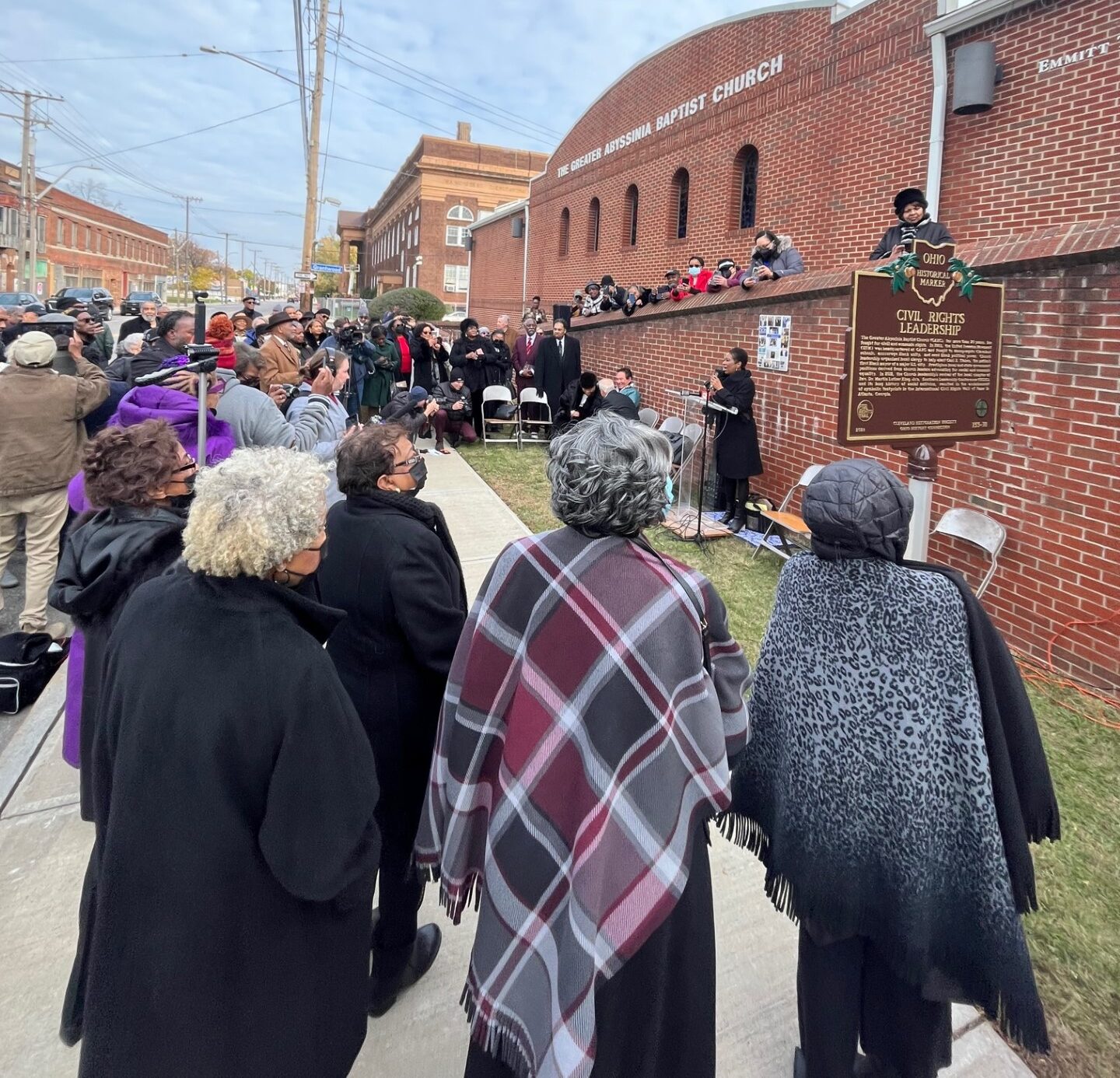 Side B: The Greater Abyssinia Baptist Church (GABC), for more than 75 years, has fought for civil and economic rights. In 1963, the United Freedom Movement (UFM) was headquartered at GABC and fought to desegregate Cleveland schools, encourage Black unity, and seed Black political power. Church leadership organized local clergy to help elect Carl B. Stokes, the nation’s first Black mayor of a major U.S. city. Prestigious local and state government positions derived from church leaders advocating for racial and economic equality. In 2012, the Church leadership’s revival of the local chapter of Rev. Dr. Martin Luther King, Jr.’s, Southern Christian Leadership Conference (SCLC), and its long history of social activism, resulted in the enshrinement of symbolic footprints in the International Civil Rights Walk of Fame in Atlanta, Georgia.