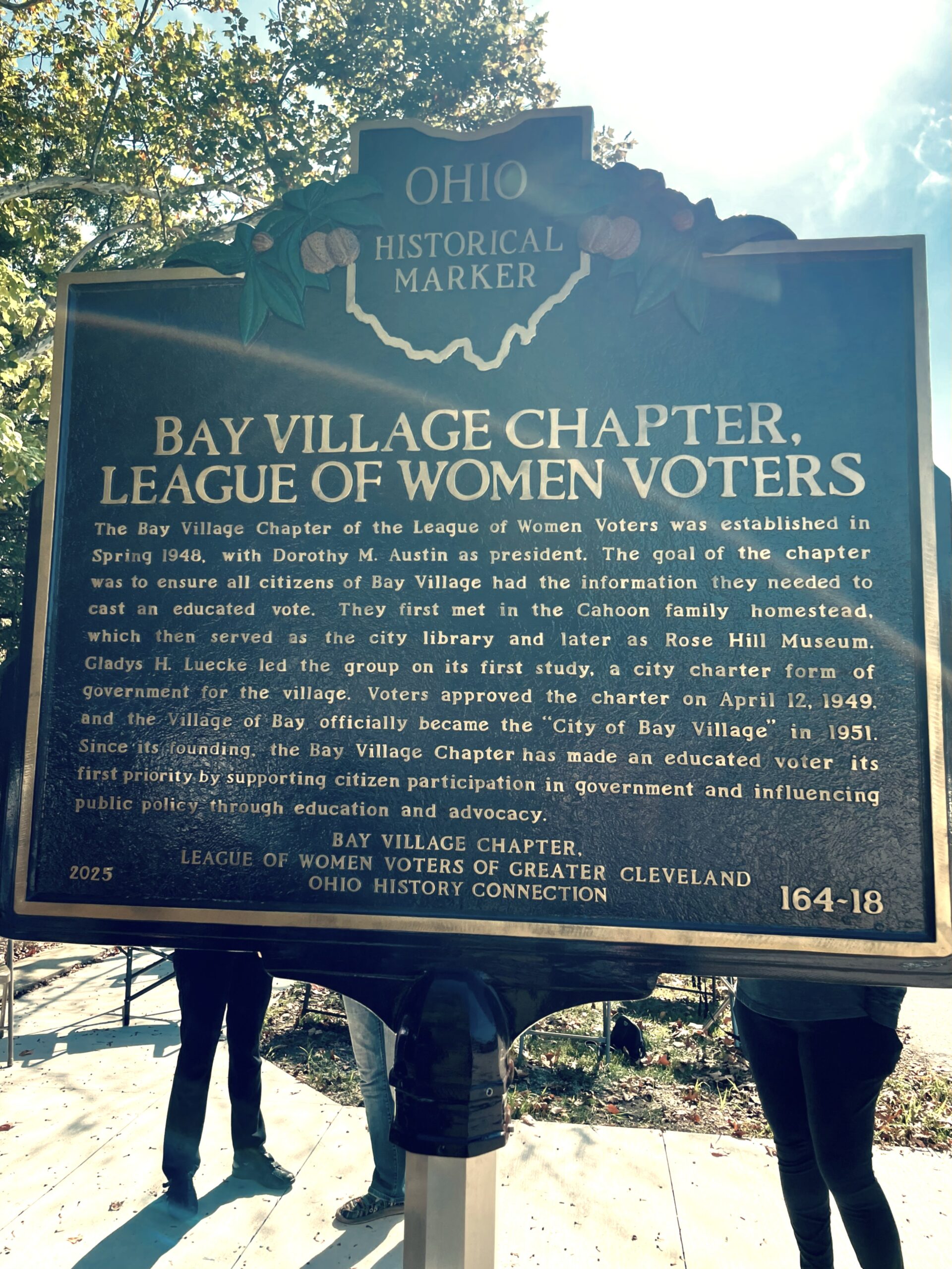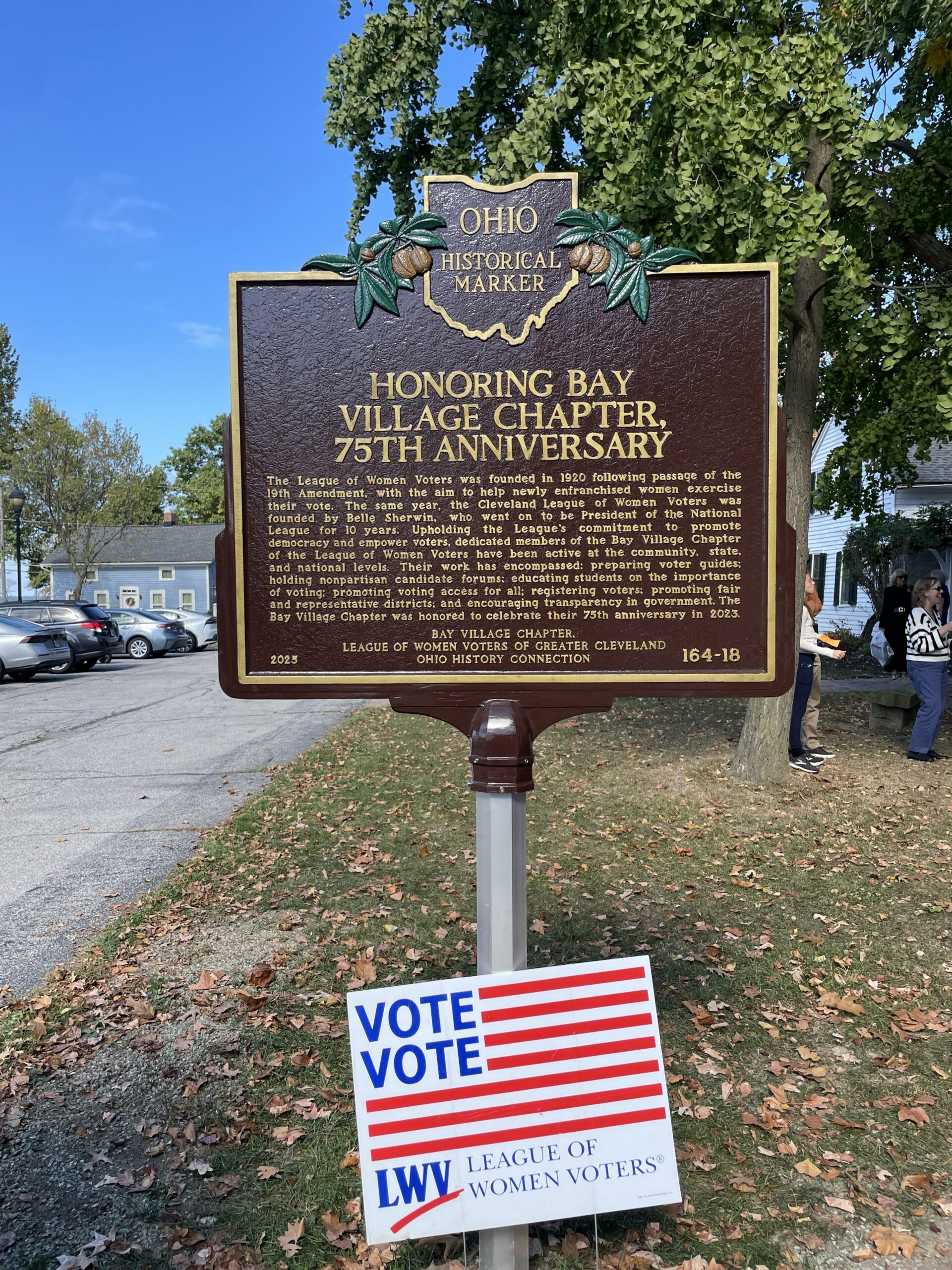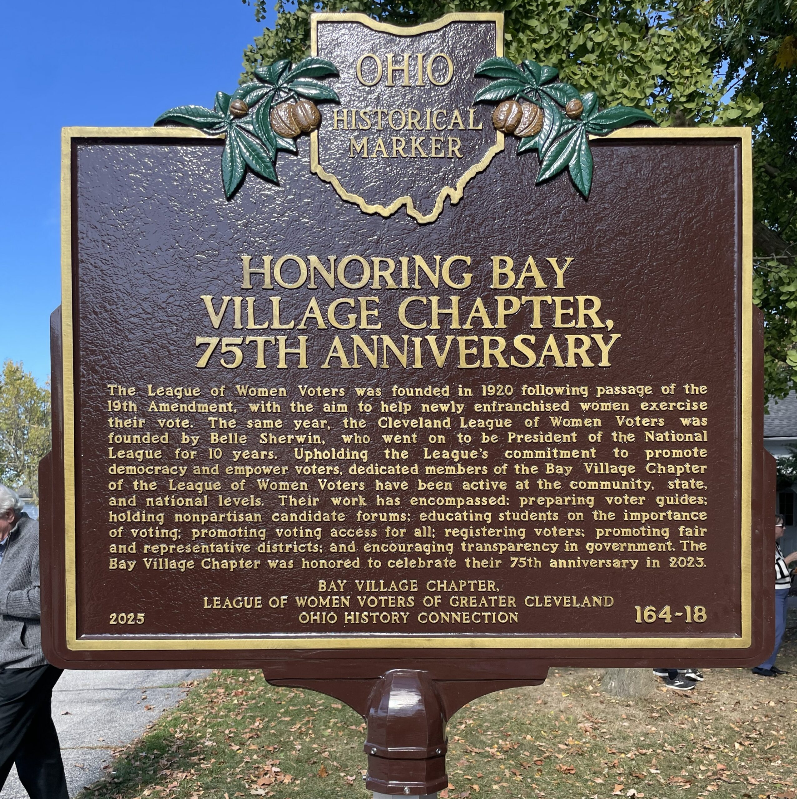 Side B: The League of Women Voters was founded in 1920 following passage of the 19th Amendment, with the aim to help newly enfranchised women exercise their vote. The same year, the Cleveland League of Women Voters was founded by Belle Sherwin, who went on to be President of the National League for 10 years. Upholding the League’s commitment to promote democracy and empower voters, dedicated members of the Bay Village Chapter of the League of Women Voters have been active at the community, state, and national levels. Their work has encompassed: preparing voter guides; holding nonpartisan candidate forums; educating students on the importance of voting; promoting voting access for all; registering voters; promoting fair and representative districts; and encouraging transparency in government. The Bay Village Chapter was honored to celebrate their 75th anniversary in 2023.