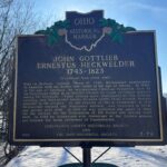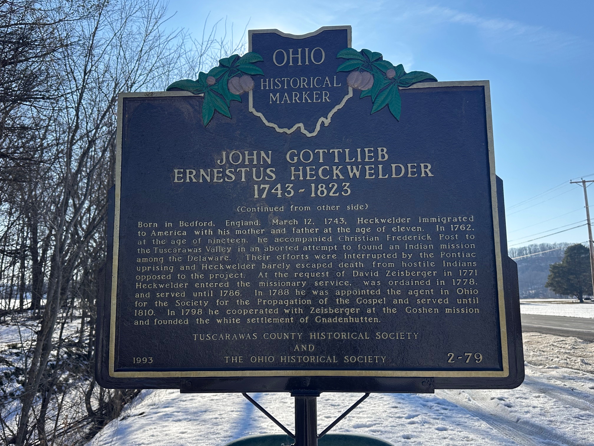 Side B: Born in Bedford, England, March 12, 1743, Heckwelder immigrated to America with his mother and father at the age of eleven. In 1762, at the age of nineteen, he accompanied Christian Frederick Post to the Tuscarawas Valley in an aborted attempt to found an Indian mission among the Delaware. Their efforts were interrupted by the Pontiac uprising and Heckwelder barely escaped death from hostile Indians opposed to the project. At the request of David Zeisberger in 1771 Heckwelder entered the missionary service, was ordained in 1778, and served until 1786. In 1788 he was appointed the agent in Ohio for the Society for the Propagation of the Gospel and served until 1810. In 1798 he cooperated with Zeisberger at the Goshen mission and founded the white settlement of Gnadenhutten.
