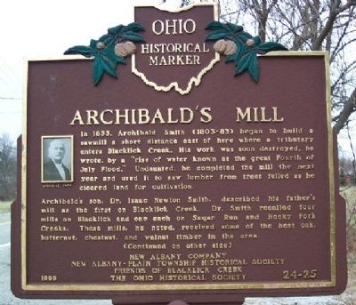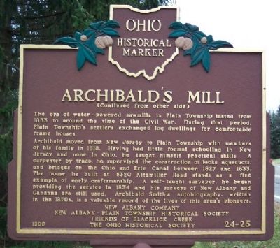 Side B: (Continued from other side) The era of water-powered sawmills in Plain Township lasted from 1833 to around the time of the Civil War. During that period, Plain Township’s settlers exchanged log dwellings for comfortable frame houses. Archibald moved from New Jersey to Plain Township with members of his family in 1818. Having had little formal schooling in New Jersey and none in Ohio, he taught himself practical skills. A carpenter by trade, he supervised the construction of locks, aqueducts, and bridges on the Ohio and Erie Canal between 1827 and 1833. The house he built at 6320 Kitzmiller Road stands as a fine example of early craftsmanship. A self-taught surveyor, he began providing the service in 1834 and his surveys of New Albany and Gahanna are still used. Archibald Smith’s autobiography, written in the 1870s, is a valuable record of the lives of this area’s pioneers.