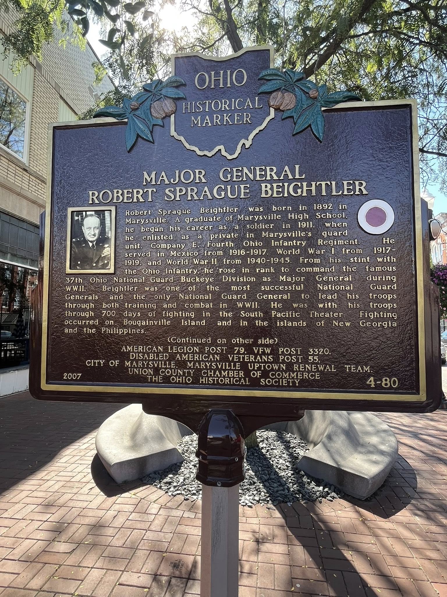 Side A: Robert Sprague Beightler was born in 1892 in Marysville. A graduate of Marysville High School, he began his career as a soldier in 1911, when he enlisted as a private in Marysville’s guard unit, Company E, Fourth Ohio Infantry Regiment. He served in Mexico from 1916-1917, World War I from 1917-1919, and World War II from 1940-1945. From his stint with the Ohio Infantry, he rose in rank to command the famous 37th Ohio National Guard Buckeye Division as Major General during WWII. Beightler was one of the most successful National Guard Generals and the only National Guard General to lead his troops through both training and combat in WWII. He was with his troops through 700 days of fighting in the South Pacific Theater. Fighting occurred on Bougainville Island and in the islands of New Georgia and the Philippines.