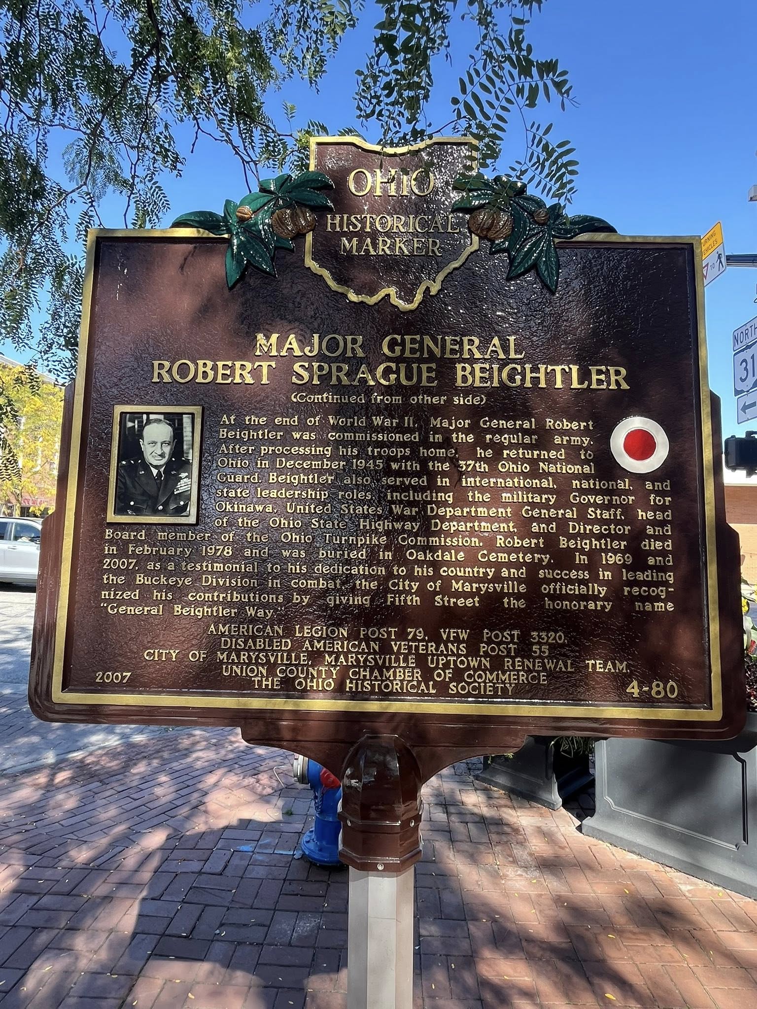 At the end of World War II, Major General Robert Beightler was commissioned in the regular army. After processing his troops home, he returned to Ohio in December 1945 with the 37th Ohio National Guard. Beightler also served in international, national, and state leadership roles, including the military Governor for Okinawa, United States War Department General Staff, head of the Ohio State Highway Department, and Director and Board member of the Ohio Turnpike Commission. Robert Beightler died in February 1978 and was buried in Oakdale Cemetery. In 1969 and 2007, as a testimonial to his dedication to his country and success in leading the Buckeye Division in combat, the City of Marysville officially recognized his contributions by giving Fifth Street the honorary name “General Beightler Way.”