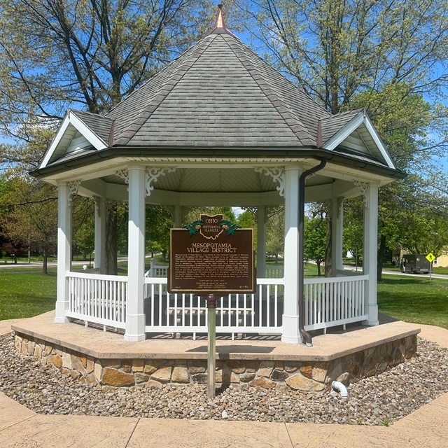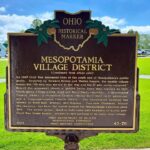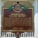 Side B: (Continued from other side) An 1867 Civil War monument rises at the south end of Mesopotamia’s public green. Sculpted by Howard Briden and Walter Supple, the marble column honors the “95 men who served in the war and the 17 who never returned.” Behind the monument stands a gabled brick Town Hall erected in 1902. North along Phelps Creek Road are three early churches: a Universalist Church (1846), a Methodist Church (1830s with 1865-1870 additions), and a Congregationalist Church (1843). The Universalist building has served as town hall, grange, and museum. Fairview Cemetery, behind the churches, has been the burial ground for Mesopotamia residents since 1818. The public green, lined on both sides with examples of mostly pre-Civil War frame houses, anchors a rare survival of an early Ohio village.
