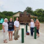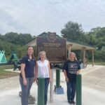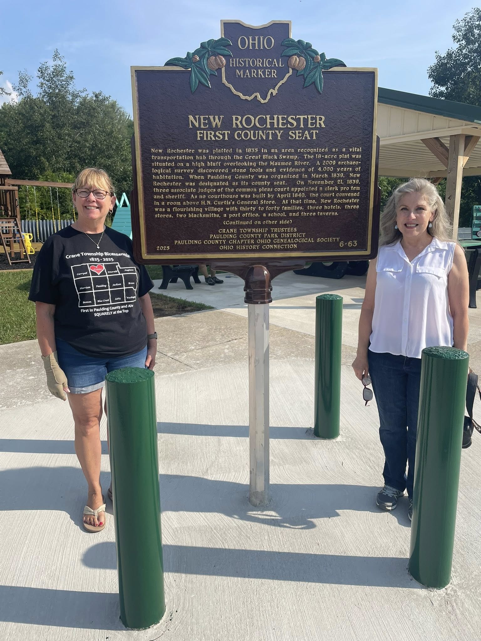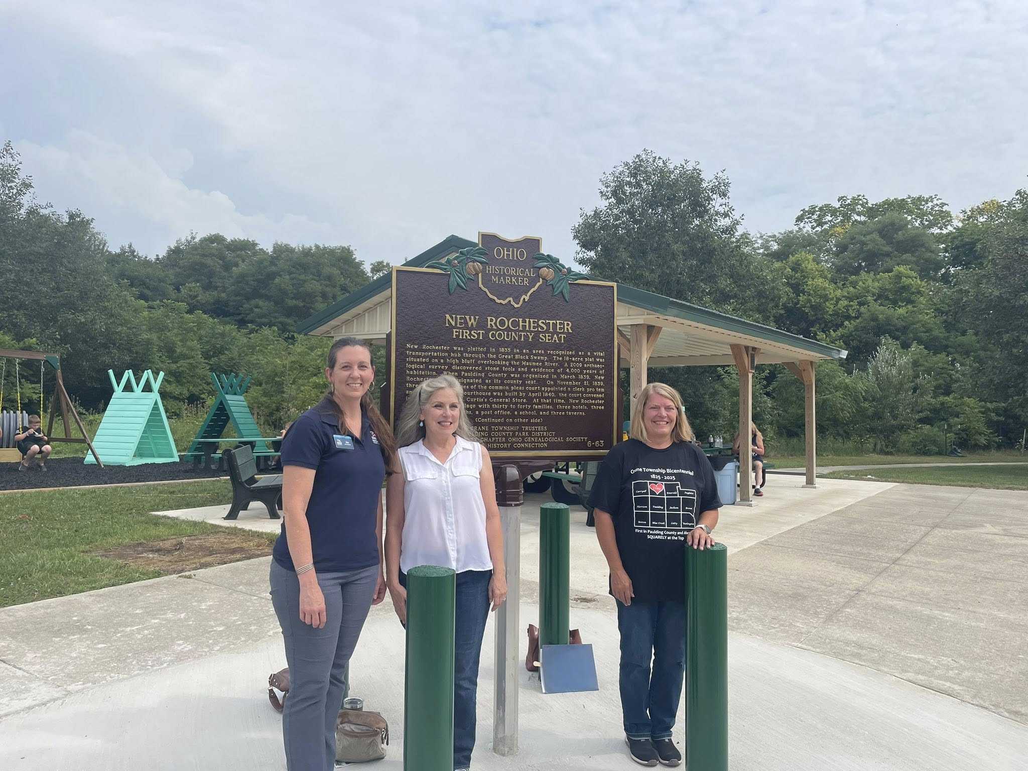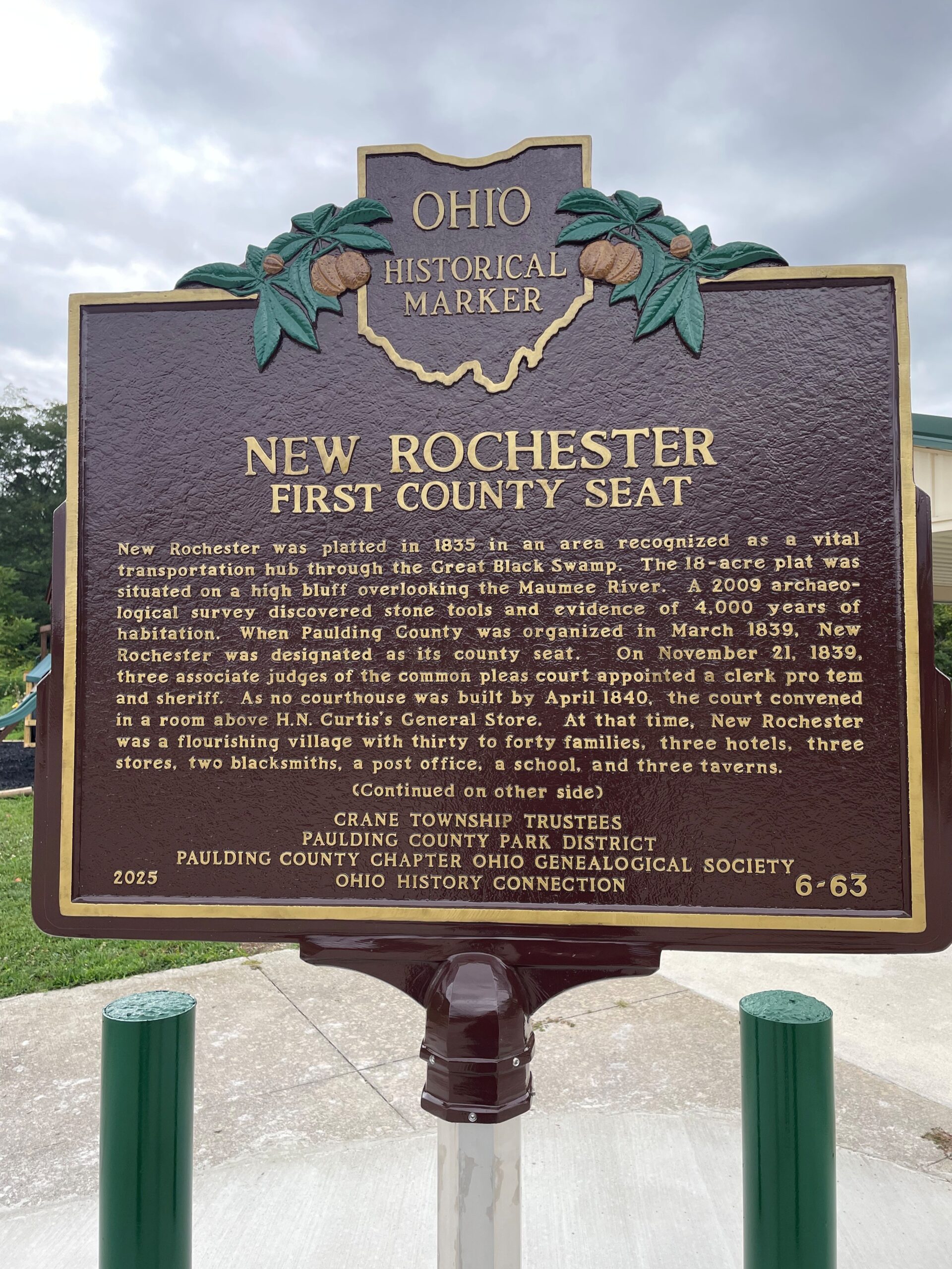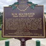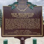 Side A: New Rochester was platted in 1835 in an area recognized as a vital transportation hub through the Great Black Swamp. The 18-acre plat was situated on a high bluff overlooking the Maumee River. A 2009 archaeological survey discovered stone tools and evidence of 4,000 years of habitation. When Paulding County was organized in March 1839, New Rochester was designated as its county seat. On November 21, 1839, three associate judges of the common pleas court appointed a clerk pro tem and sheriff. As no courthouse was built by April 1840, the court convened in a room above H.N. Curtis’s General Store. At that time, New Rochester was a flourishing village with thirty to forty families, three hotels, three stores, two blacksmiths, a post office, a school, and three taverns. (Continued on other side)