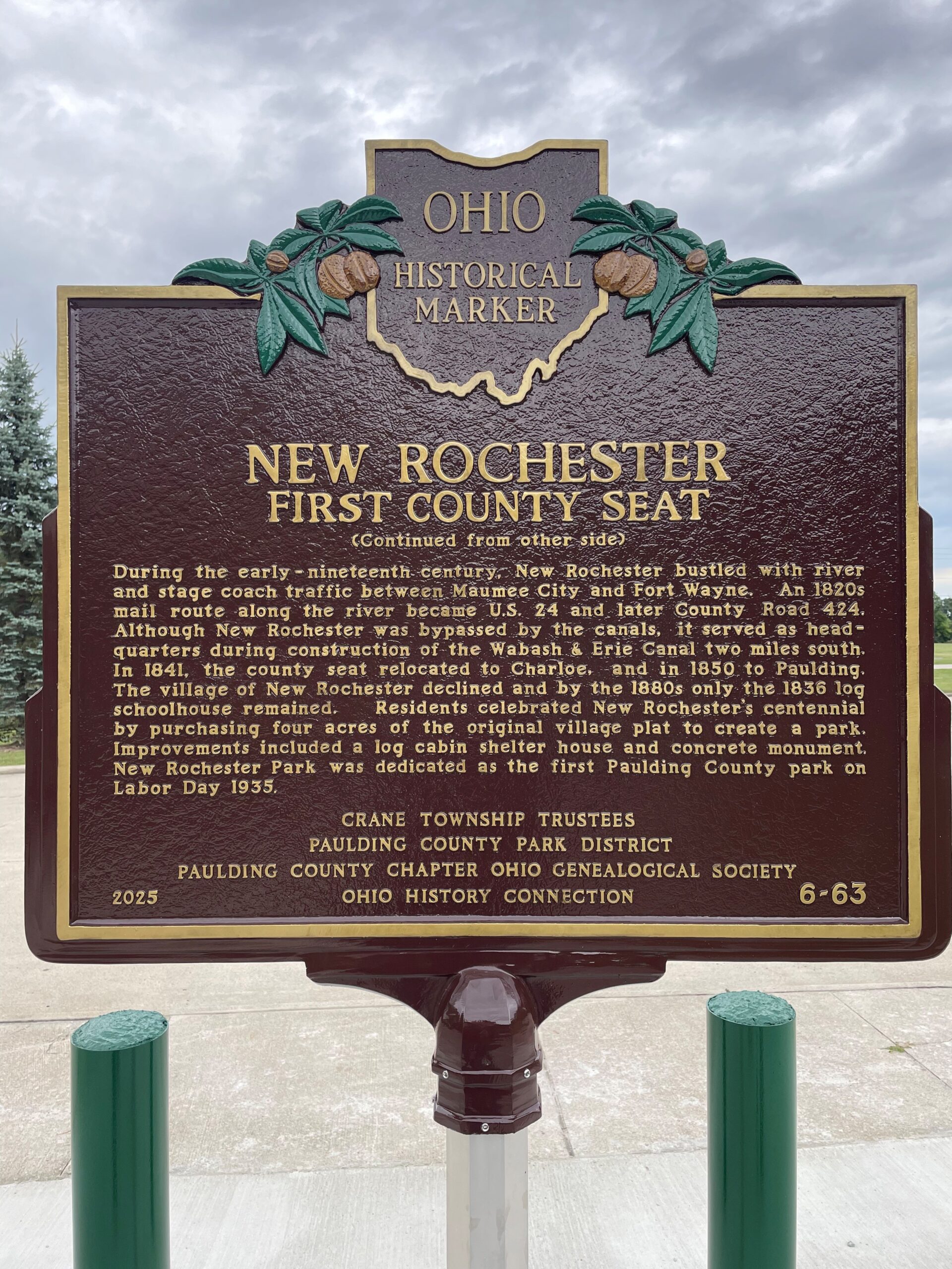 Side B: (Continued from other side) During the early-nineteenth century, New Rochester bustled with river and stage coach traffic between Maumee City and Fort Wayne. An 1820s mail route along the river became U.S. 24 and later County Road 424. Although New Rochester was bypassed by the canals, it served as headquarters during construction of the Wabash & Erie Canal two miles south. In 1841, the county seat relocated to Charloe, and in 1850 to Paulding. The village of New Rochester declined and by the 1880s only the 1836 log schoolhouse remained. Residents celebrated New Rochester’s centennial by purchasing four acres of the original village plat to create a park. Improvements included a log cabin shelter house and concrete monument. New Rochester Park was dedicated as the first Paulding County park on Labor Day 1935.