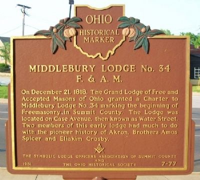 Side A: On December 21, 1818, The Grand Lodge of Free and Accepted Masons of Ohio granted a Charter to Middlebury Lodge No. 34 marking the beginning of Freemasonry in Summit County. The Lodge was located on Case Avenue, then known as Water Street. Two members of this early lodge had much to do with the pioneer history of Akron, Brothers Amos Spicer and Eliakim Crosby. [Masonic Emblem]