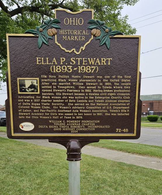 Side A: Ella Nora Phillips Myers Stewart was one of the first practicing Black women pharmacists in the United States. After she married William Stewart in 1920, the couple settled in Youngstown, then moved to Toledo where they opened Stewart’s Pharmacy in 1922. Having broken professional barriers, Ella Stewart became a tireless civil rights champion. Advocating for Black women she was active in the Enterprise Charity Club and was a 1937 charter member of Beta Lambda and Toledo Alumnae chapters of Delta Sigma Theta Sorority. She served on the National Association of Colored Women Clubs, the Women’s Advisory Committee of U.S. Department of Labor, and Pan-Pacific Southeast Asia Women’s Association. Toledo’s Ella P. Stewart Academy for Girls was named in her honor in 1961. She was inducted into the Ohio Women’s Hall of Fame in 1978.