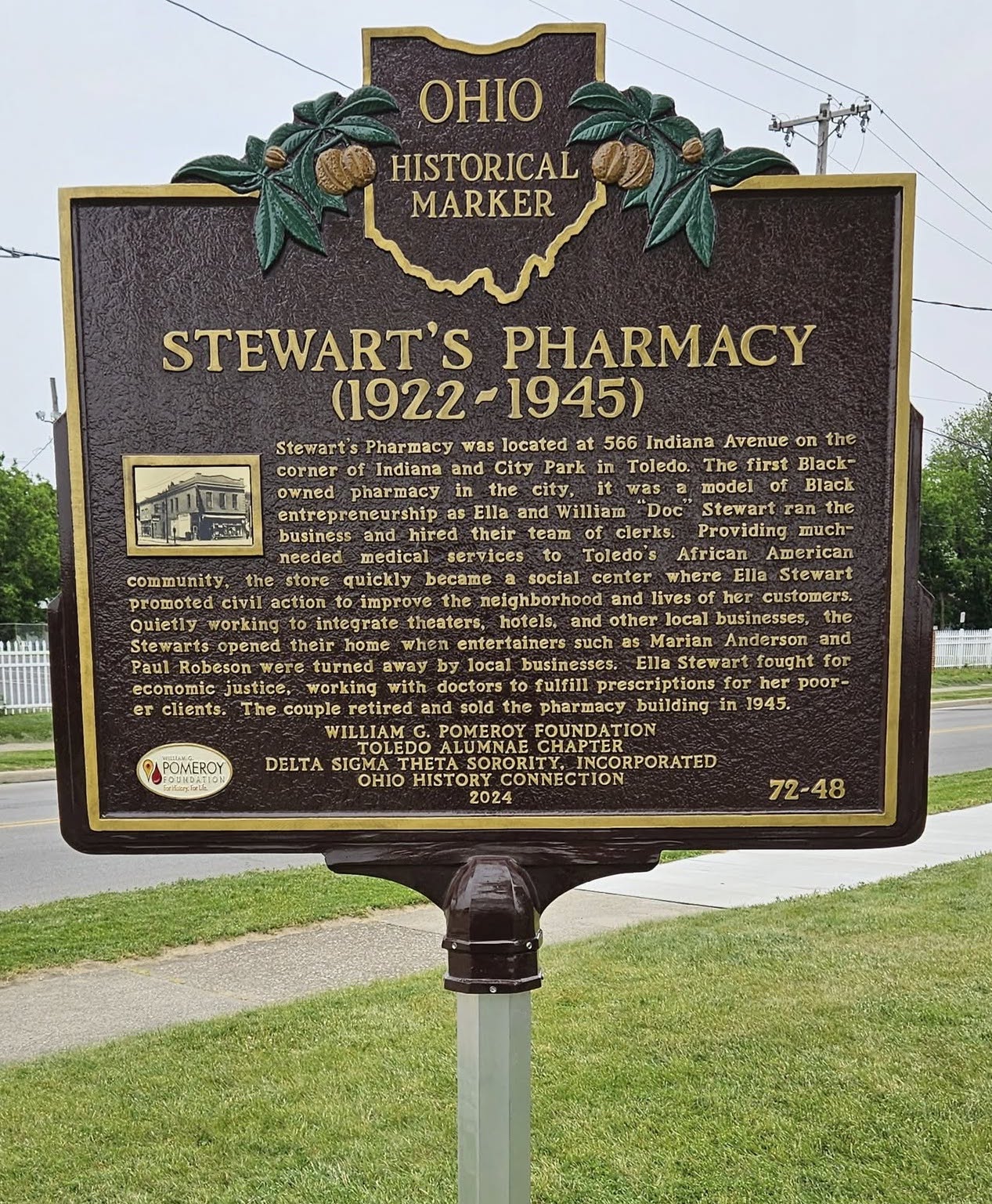 Side B: Stewart’s Pharmacy was located at 566 Indiana Avenue on the corner of Indiana and City Park in Toledo. The first Black-owned pharmacy in the city, it was a model of Black entrepreneurship as Ella and William “Doc” Stewart ran the business and hired their team of clerks. Providing much-needed medical services to Toledo’s African American community, the store quickly became a social center where Ella Stewart promoted civil action to improve the neighborhood and lives of her customers. Quietly working to integrate theaters, hotels, and other local businesses, the Stewart’s opened their home when entertainers such as Marian Anderson and Paul Roberson were turned away by local businesses. Ella Stewart fought for economic justice, working with doctors to fulfill prescriptions for her poorer clients. The couple retired and sold the pharmacy building in 1945.