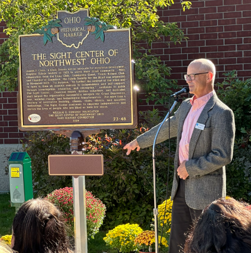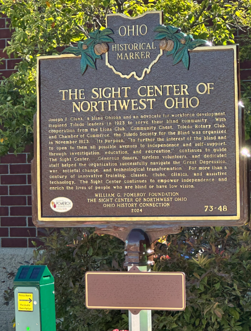 Side A: Joseph F. Clunk, a blind Ohioan and an advocate for workforce development, inspired Toledo leaders in 1923 to serve their blind community. With cooperation from the Lions Club, Community Chest, Toledo Rotary Club, and Chamber of Commerce, the Toledo Society for the Blind was organized in November 1923. Its purpose, “to further the interest of the blind and to open to them all possible avenues to independence and self-support, through investigation, education, and recreation,” continues to guide The Sight Center. Generous donors, tireless volunteers, and dedicated staff helped the organization successfully navigate the Great Depression, war, societal change, and technological transformation. For more than a century of innovative training, classes, clubs, clinics, and assistive technology, The Sight Center continues to empower independence and enrich the lives of people who are blind or have low vision.