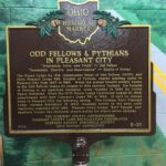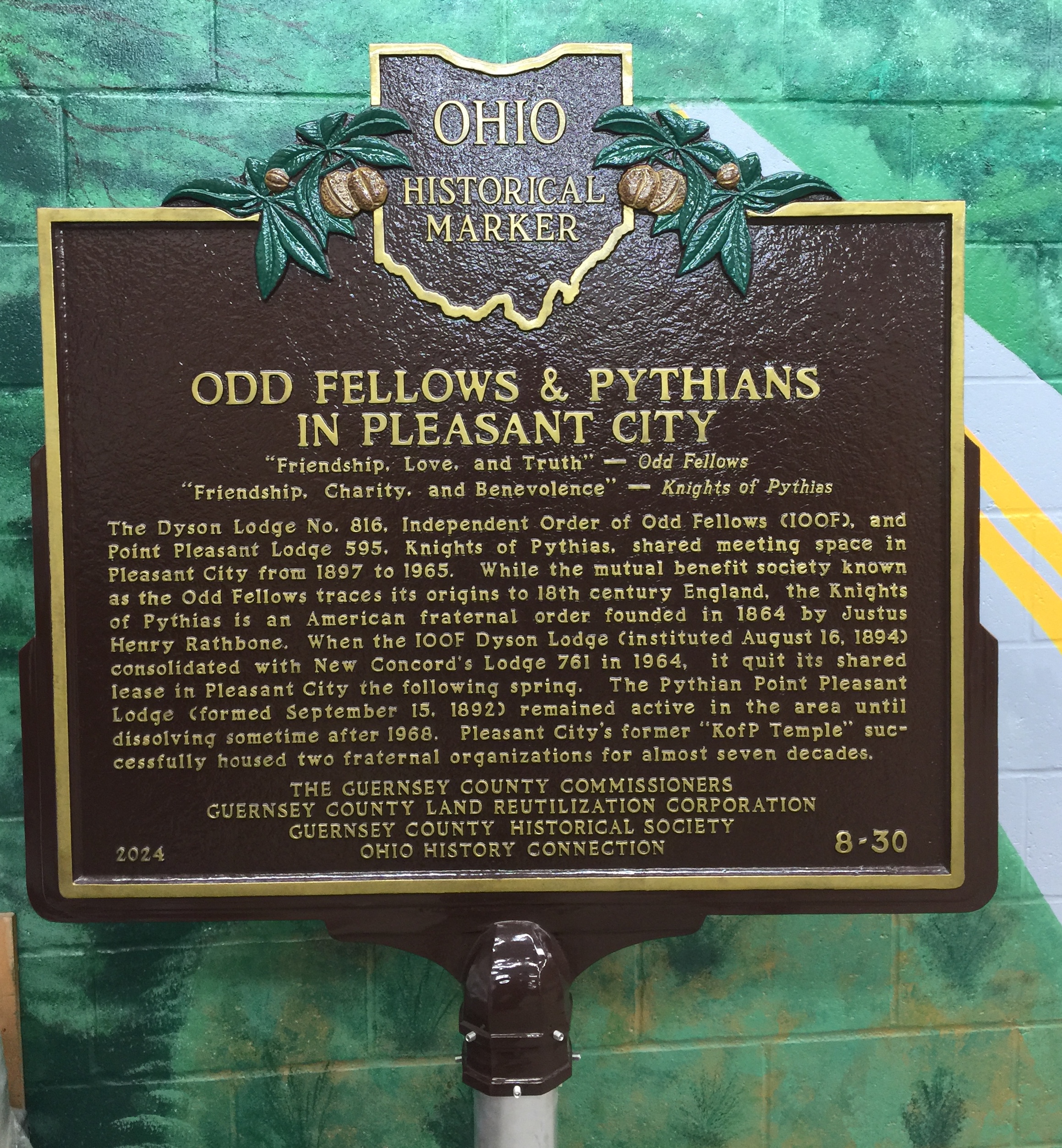 Side B: The Dyson Lodge No. 816, Independent Order of Odd Fellows (IOOF), and Point Pleasant Lodge 595, Knights of Pythias, shared meeting space in Pleasant City from 1897 to 1965. While the mutual benefit society known as the Odd Fellows traces its origins to 18th century England, the Knights of Pythias is an American fraternal order founded in 1864 by Justus Henry Rathbone. When the IOOF Dyson Lodge (instituted August 16, 1894) consolidated with New Concord’s Lodge 761 in 1964, it quit its shared lease in Pleasant City the following spring. The Pythian Point Pleasant Lodge (formed September 15, 1892) remained active in the area until dissolving sometime after 1968. Pleasant City’s former “KofP Temple” successfully housed two fraternal organizations for almost seven decades.