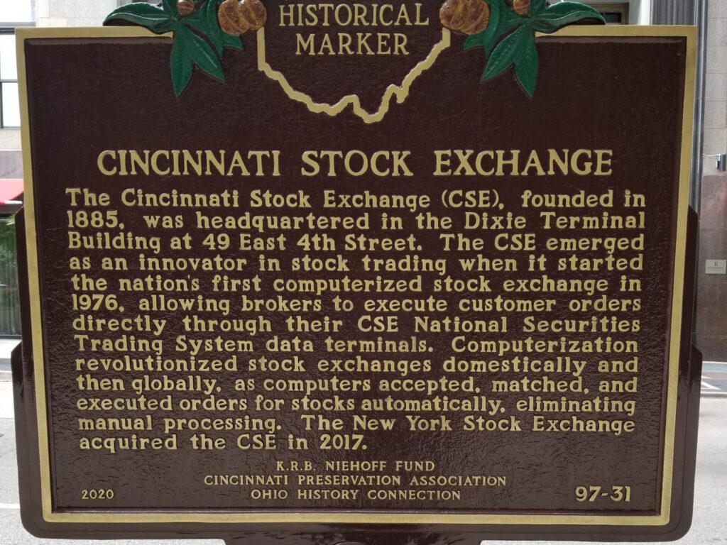 The Cincinnati Stock Exchange (CSE), founded in 1885, was headquartered in the Dixie Terminal Building at 49 East 4th Street. The CSE emerged as an innovator in stock trading when it started the nation’s first computerized stock exchange in 1976, allowing brokers to execute customer orders directly through their CSE National Securities Trading System data […]
